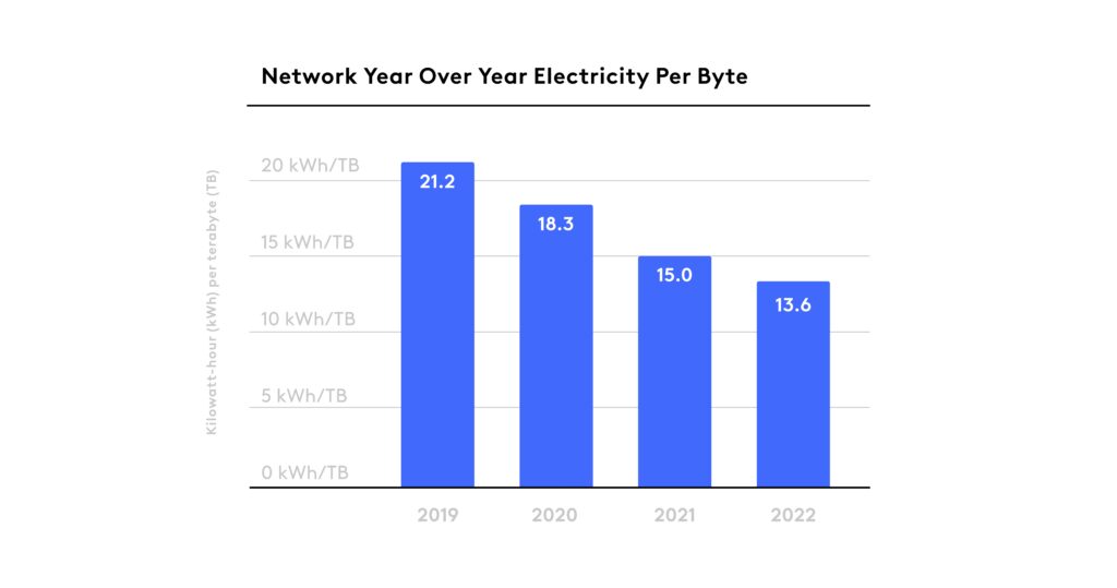 Comcast decreased the electricity per consumed byte from 21.2 kilowatt-hours (kWh) per terabyte (TB) in 2019 to 13.6 kWh/TB in 2022. Ongoing investments in innovation, software, AI, and other virtual and physical critical infrastructure require less hardware, less space, and less energy per byte than previous technologies.