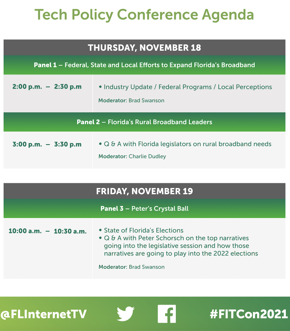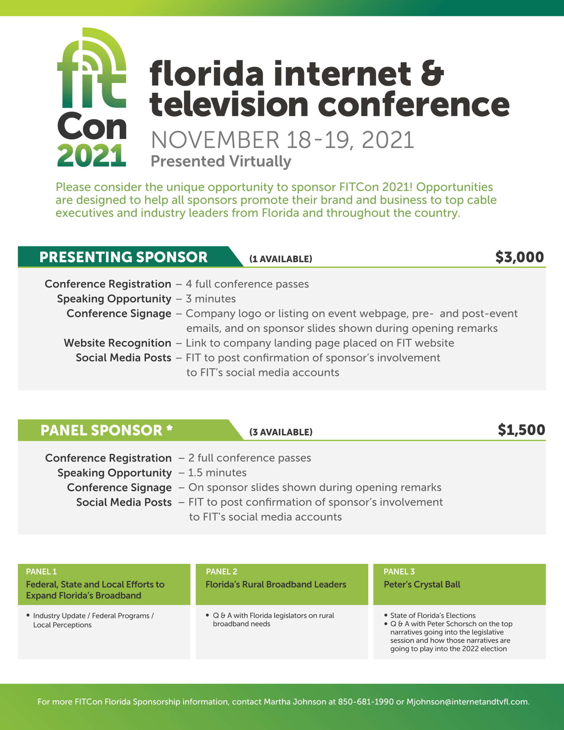 FITCon Policy Conference sponsorship opportunities are still available. Please contact Martha Johnson at mjohnson@internetandtvfl.com or (850) 681-1990.